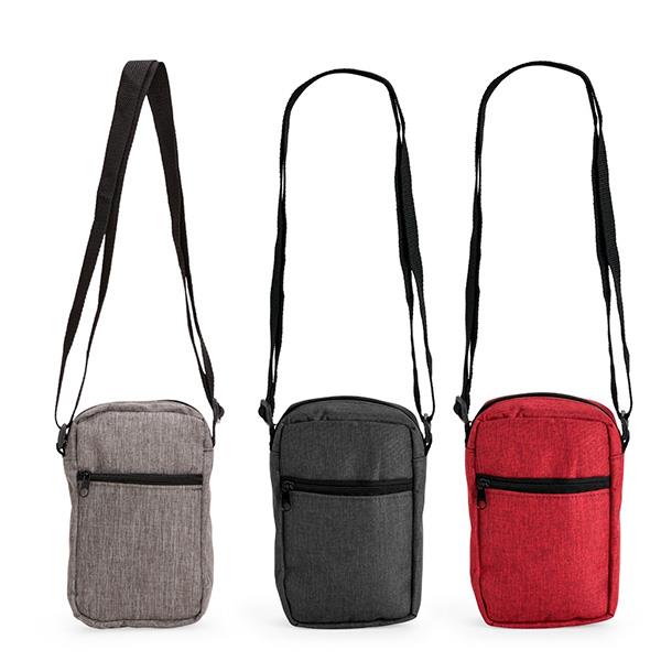 Bolsa de ombro resistente à água, confeccionada em poliéster mesclado com PVC, com fechamento em zíper e alça ajustável. Possui divisória em tela de nylon no compartimento interno e um bolso frontal para a organização de objetos. Tamanho aproximado: 19 x 13 x 5,5cm