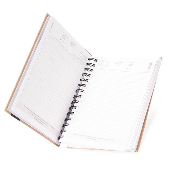 Agenda diária 2026 com capa dura kraft, com encadernação em wire-o, dados pessoais, calendários 2025 a 2027, orçamento pessoal, planejamento mensal, espaço para anotações diárias, lista de contatos e mapas, tamanho aproximado 20,7 x 15,5 cm.