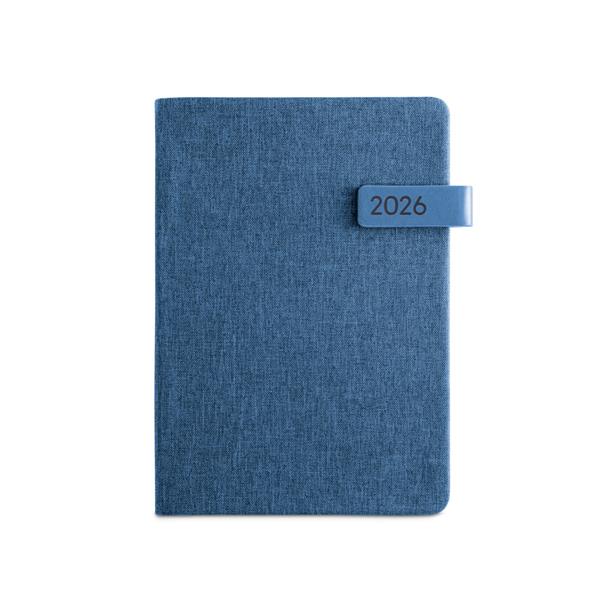 Agenda A5 em PET reciclado (100% rPET), com fecho magnético em PU. Possui um marcador em fita e suporte para esferográfica (não inclusa). Está organizada num plano diário. Fornecida com bolsa de non-woven. 148 x 210 mm - Bolsa: 205 x 250 mm