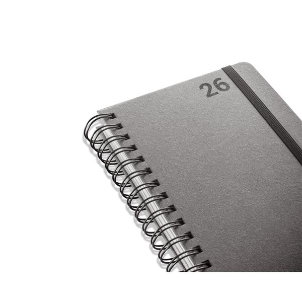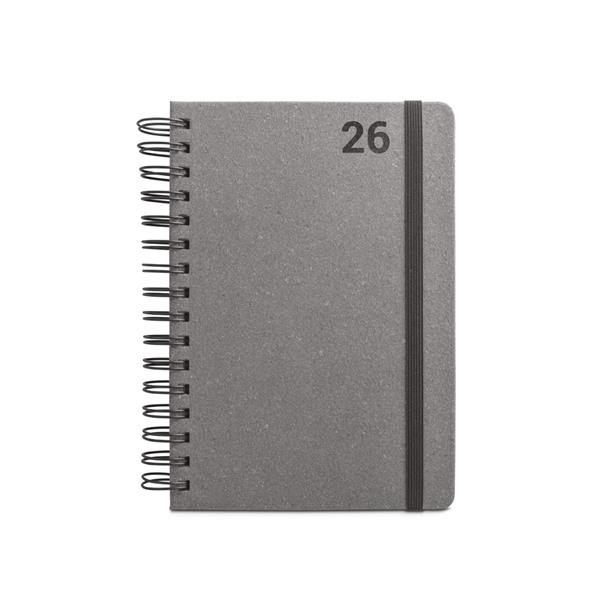 Agenda diária 2026 com capa (58% reciclada), com encadernação em wire-o e elástico para fechamento, tamanho aproximado 14,8 x 21 cm.