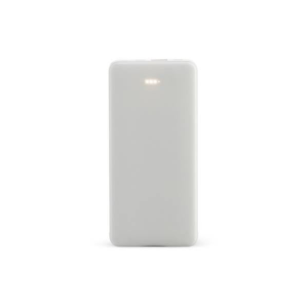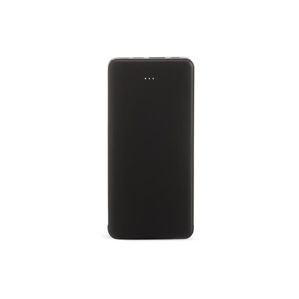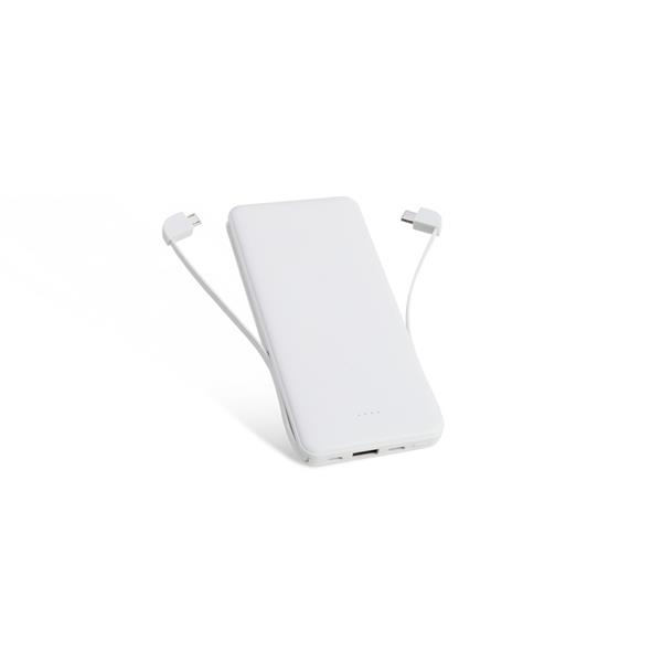 Carregador portátil power bank de plástico com a capacidade para 10.000mAh com indicador de bateria, possui 02 cabos integrados com saída USB-C e V8, e acompanha cabo USB V8 e Adaptador Lightning, tamanho aproximado 14,9 x 7 x 1,6 cm.