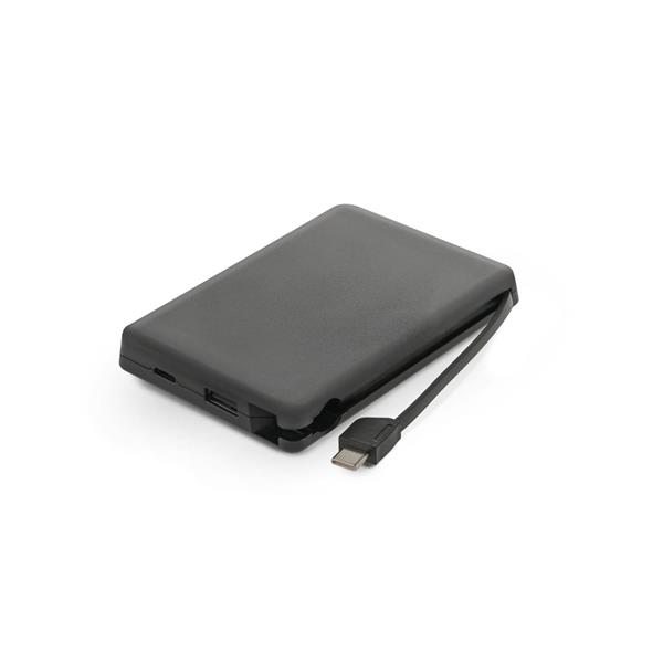 Bateria portátil em ABS 100% reciclado, com cabo integrado. Bateria portátil com capacidade de 10.000 mAh, indicador de nível de carga, uma porta de entrada e saída USB-C, uma porta de saída USB-A e um cabo USB-C integrado, de entrada e saída, para maior comodidade, permitindo carregar de forma prática quer a própria bateria portátil, quer os seus dispositivos móveis. A bateria permite carregar dois dispositivos em simultâneo. Fornecida em caixa presente de papel kraft reciclado. Tamanho aproximado: 113 x 73 x 16 mm