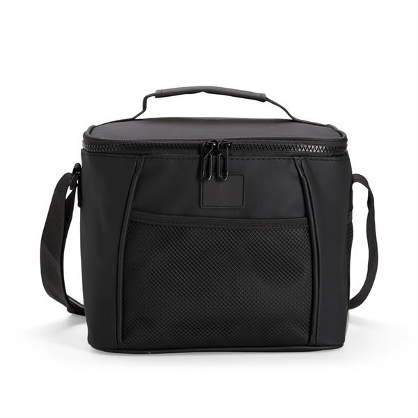 Bolsa térmica confeccionada em poliéster mesclado com PVC impermeável, fechamento em zíper e capacidade máxima de 10 litros. Conta com revestimento térmico em PEVA atóxico, o que oferece maior tempo para a conservação da temperatura de alimentos e bebidas. Apresenta placa emborrachada para personalização, dois bolsos abertos em tela de nylon com elástico, além de alça de mão e alça transversal. Tamanho aproximado: 18 x 21 x 16 cm (AxLxP).