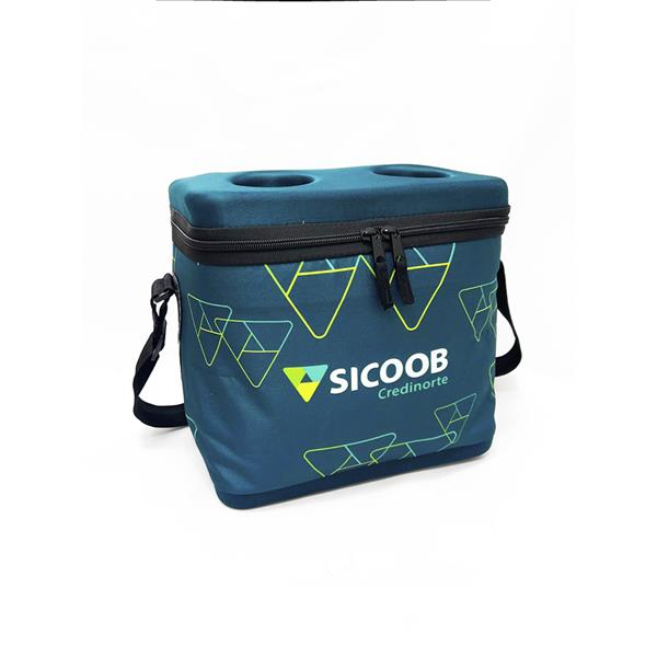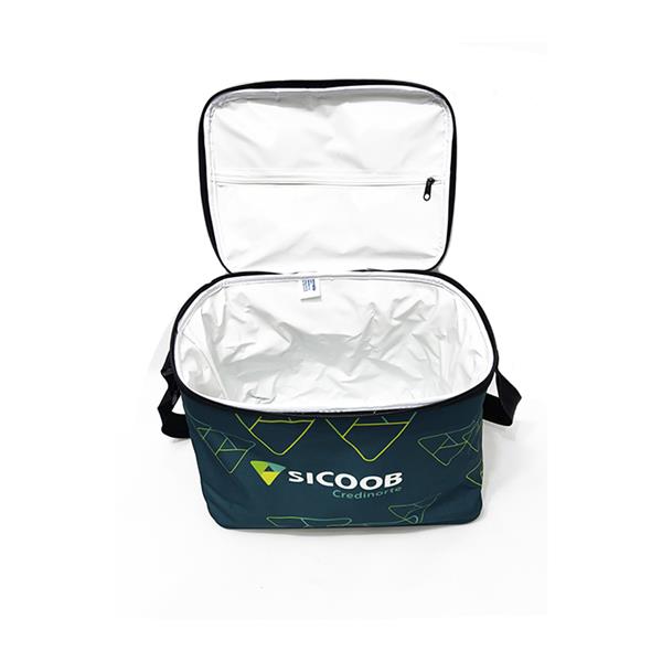 Bolsa Térmico em Nylon 70 PVC ou Poliéster 600 resinado, com tampa e fundo em E.V.A. revestidos em helanca. Possui alça de ombro de 40 mm, bolso interno com zíper e isolante térmico em isomanta, além de ser revestida internamente com bagun espelhado de 0,30 mm. O fechamento é realizado por solda eletrônica, garantindo 100% de impermeabilidade. As dimensões são 30 x 22 x 30 cm (capacidade aproximada de 17 litros), suportando até 12 garrafas long neck ou 18 latas de 350 ml.