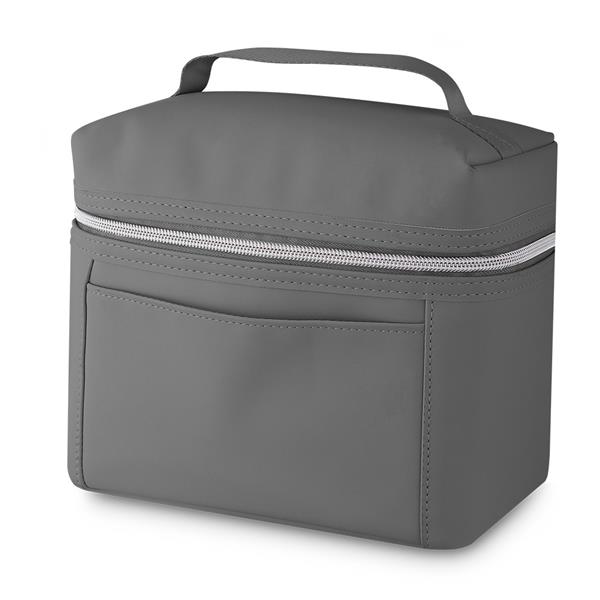 Bolsa Térmica em PU com Zíper prática e resistente, com parte interna costurada, bolso frontal e alça de mão. Ideal para uso diário, eventos e brindes corporativos. Capacidade de 5 Litros e tamanho aproximado 18x21,5x13cm (AxLxP).