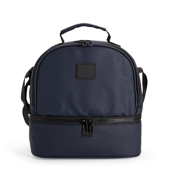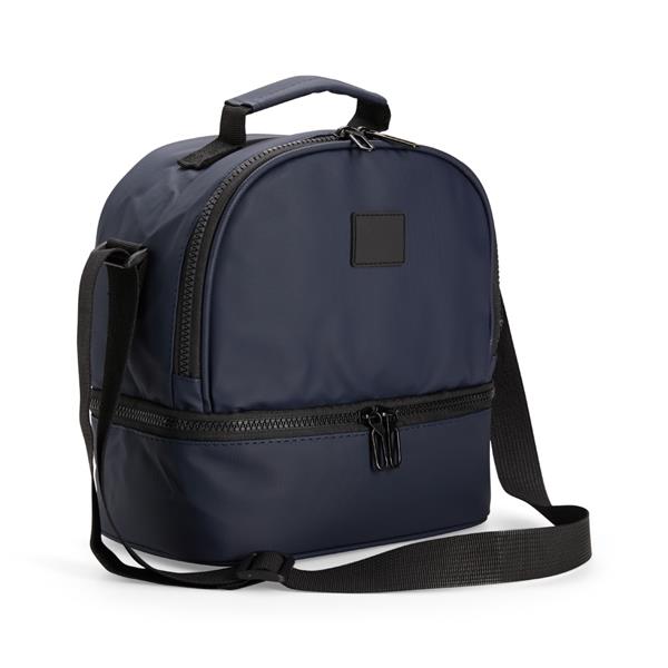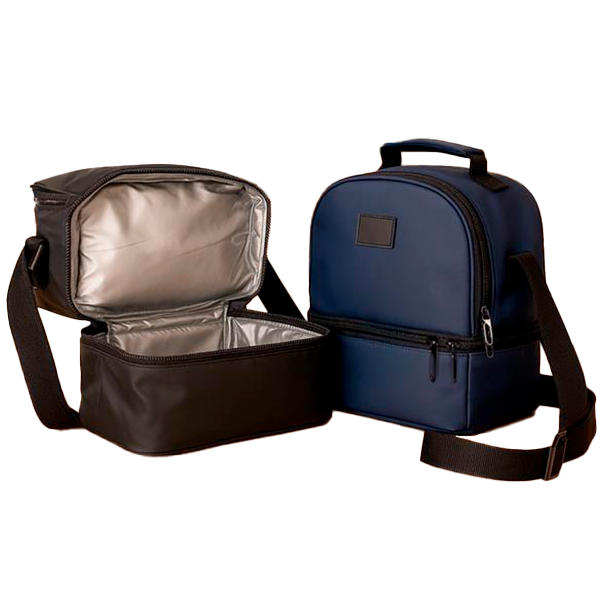Bolsa térmica confeccionada em poliéster mesclado com PVC impermeável, fechamento em zíper e capacidade de até 7 litros na soma de seus dois compartimentos térmicos individuais revestidos em PEVA atóxico. Conta com placa emborrachada para personalização, uma alça de mão e alça transversal. Tamanho aproximado: 23,5 x 22,5 x 14,5 (Altura x Largura x Profundidade)