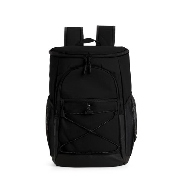 Mochila térmica confeccionada em poliéster impermeável com detalhes em couro sintético e capacidade máxima de 13 litros, distribuída em dois compartimentos revestidos em PEVA: um interno antivazamento e outro, menor, localizado na parte externa. Possui ainda três bolsos externos, incluindo dois em tela de nylon com elástico e um com fechamento em zíper e cordão de elástico ajustável, além de alças e painel traseiro revestidos em espuma respirável. Tamanho aproximado: 35 x 26cm