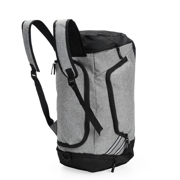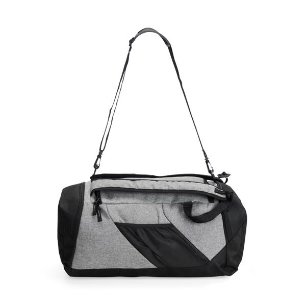 Bolsa de viagem confeccionada em poliéster resistente à água e capacidade para até 32 litros. Possui alças ajustáveis e acolchoadas para as costas, o que permite seu uso também como mochila. Além do compartimento interno principal, conta com três bolsos externos, incluindo um dedicado para tênis. Acompanha alça transversal removível.