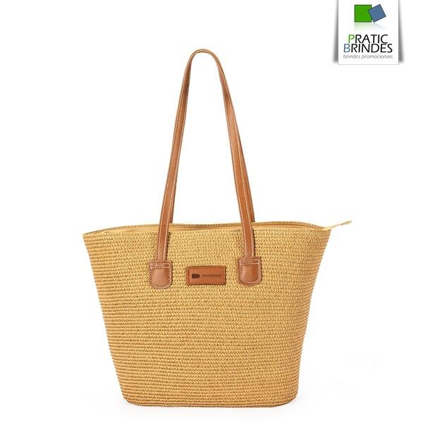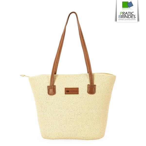 Bolsa em fios de papel torcido costurados com linha de nylon e fechamento em zíper. Possui compartimento interno com bolso compacto, além de alças e detalhes em couro sintético, incluindo plaquinha frontal costurada.