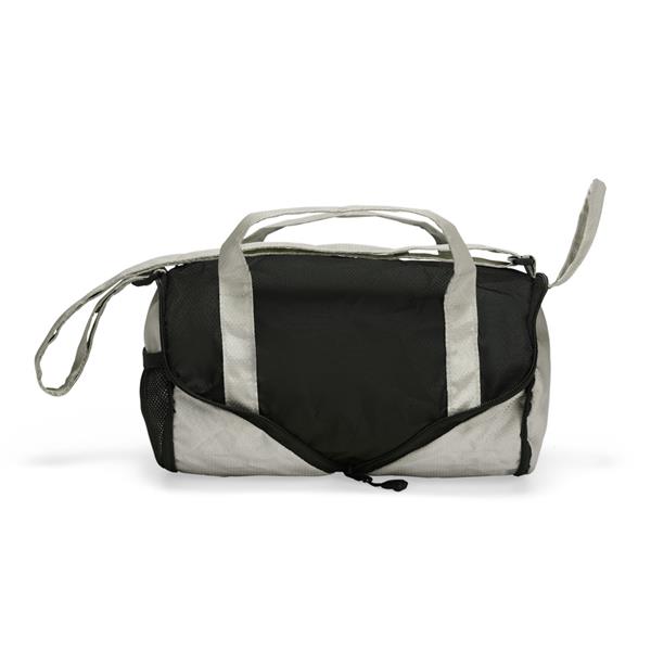 Bolsa esportiva em poliéster 420D resistente à água, com fechamento em zíper e capacidade de 6 litros. Quando dobrada, mantém formato arredondado com bolso telado e uma alça de mão para transporte. Aberta, possui dois bolsos externos: um frontal aberto e outro lateral em tela de nylon com elástico. Conta ainda com duas alças laterais fixas e uma alça transversal ajustável. Tamanho aproximado: 16 x 28 x 16cm