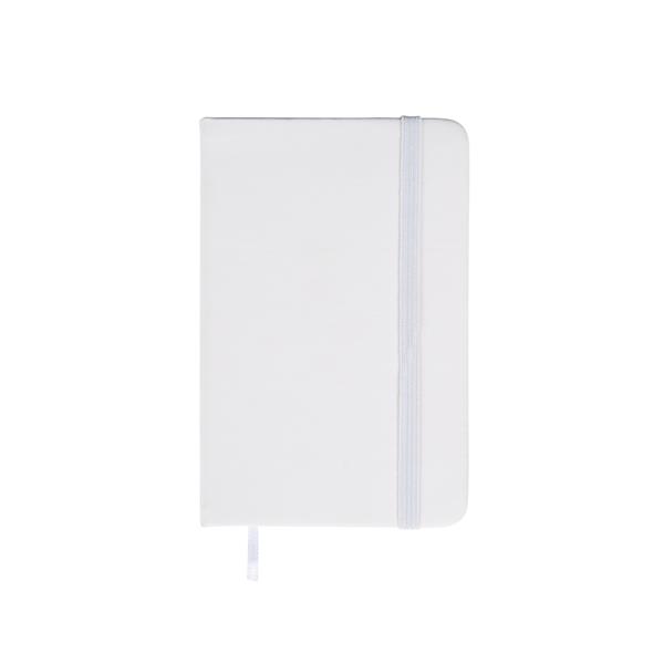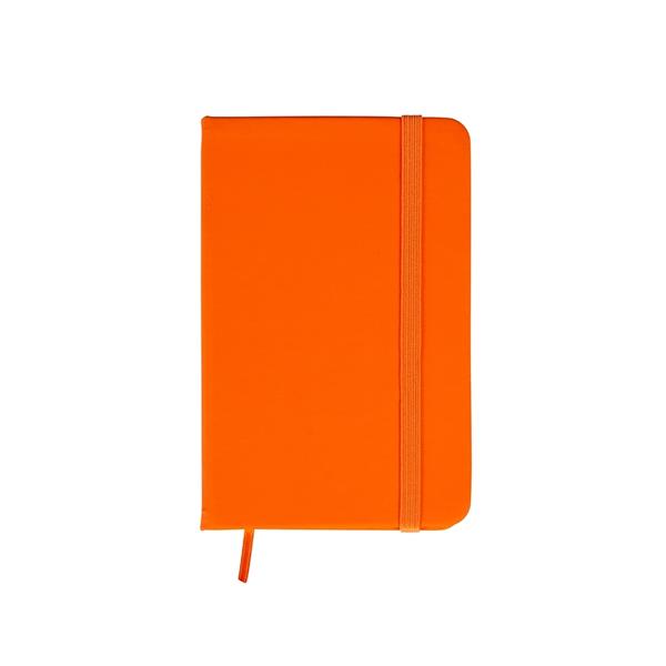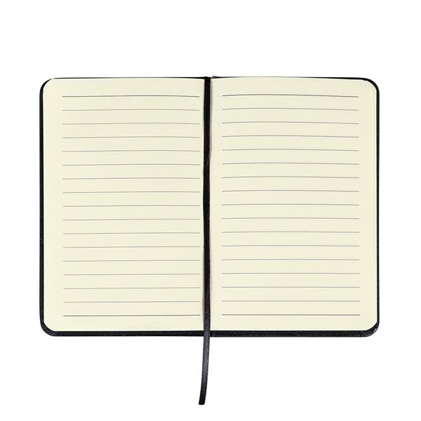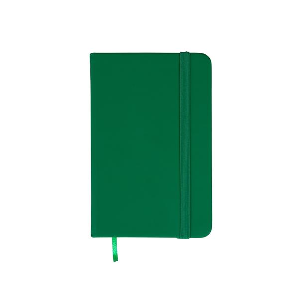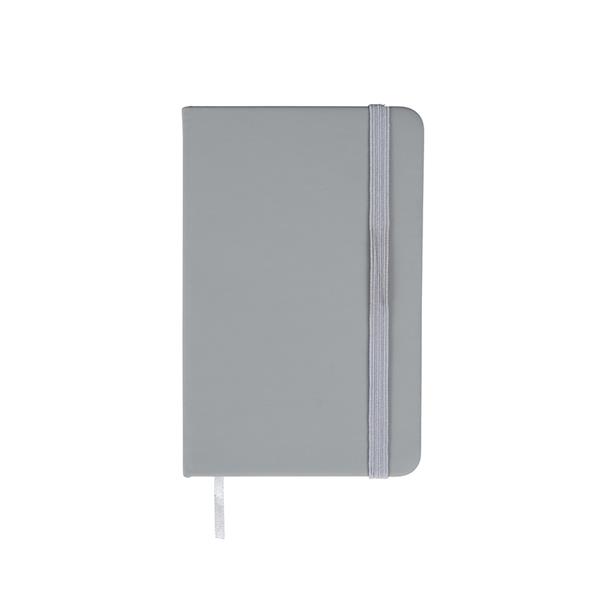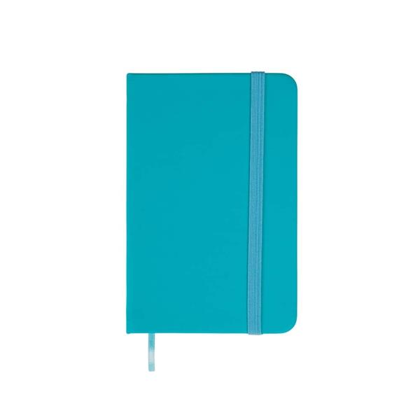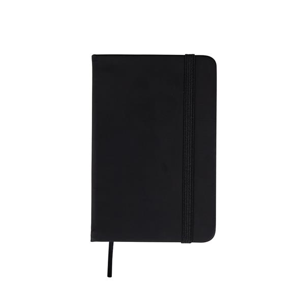 Bloco de anotação tipo moleskine de bolso com capa dura emborrachado, com 80 folhas pautadas na cor pardo, fita separadora e elástico, no tamanho de 9 x 14 cm.