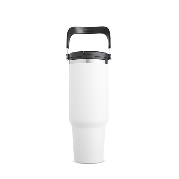 Copo térmico em inox com capacidade de até 1,25 litro. Possui estrutura de parede dupla e tampa plástica rosqueável com vedação a vácuo, o que permite conservar a temperatura de líquidos por mais tempo. Conta ainda com alça para transporte em inox com revestimento em plástico e canudo plástico removível.