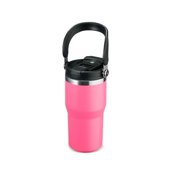 Copo térmico em inox com pintura eletrostática e capacidade máxima de 600ml. Conta com estrutura de parede dupla e vedação a vácuo que permite a conservação da temperatura de líquidos por mais tempo. Possui tampa plástica rosqueável com protetor para o bocal, bico flip, canudo interno removível e alça fixa para transporte.