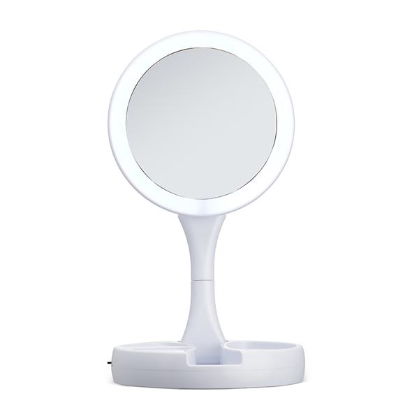 Espelho Dobrável com LED e dupla face, material plástico. O espelho possui uma das faces ampliada 10x e do outro lado, espelho convencional 1x, iluminação LED dos dois lados, três compartimentos na base para armazenamento de acessórios, espelho giratório e regulável, botão liga/desliga e botão para acionar a iluminação, com funcionamento à base de 4 pilhas AA (não acompanha) ou via cabo USB.