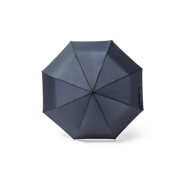 Guarda-chuva dobrável de 23" em 100% poliéster reciclado pongee 190T (100% rPET). Varetas em fibra de vidro, haste metálica e pega em ABS reciclado (35% reciclado). O guarda-chuva tem abertura e fecho automático, sendo também à prova de vento e dobrável em 3 seções. Fornecido em bolsa. Tamanho aproximado: ø1050 x 330 mm