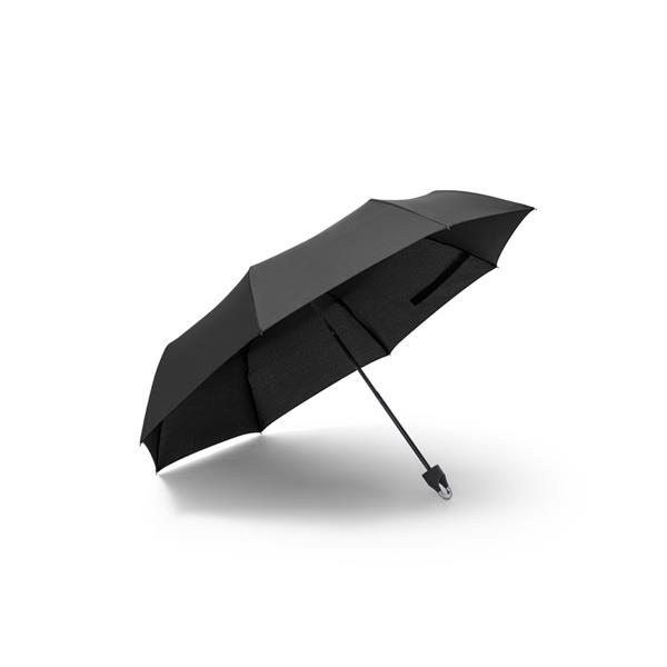 Guarda-chuva de 21" em poliéster 100% reciclado pongee 190T, com varetas em fibra de vidro, haste metálica e pega em ABS reciclado. O guarda-chuva, dobrável em 3 seções, tem abertura manual e é à prova de vento. Fornecido numa bolsa individual.