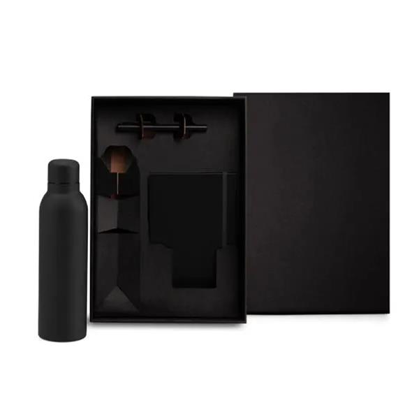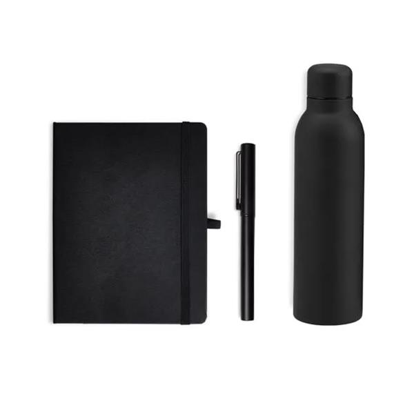 Kit boas vindas composto por caderno para anotação capa durae emborrachado preto com elástico para fechamento e porta caneta, caneta esferográfica com tampa na cor preto e garrafa de inox preto de 500ml e tampa rosqueável, acomodados em uma caixa presente kraft preta.