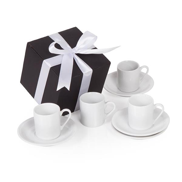 4 Xicaras de porcelana com pires para café 60ml (altura 5,5 x 5cm diametro) Caixa corte e vinco em papel cartão preto 400g com laço de cetim