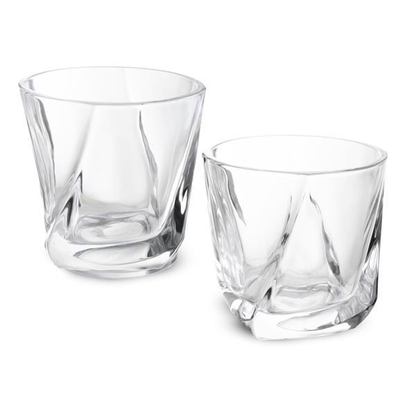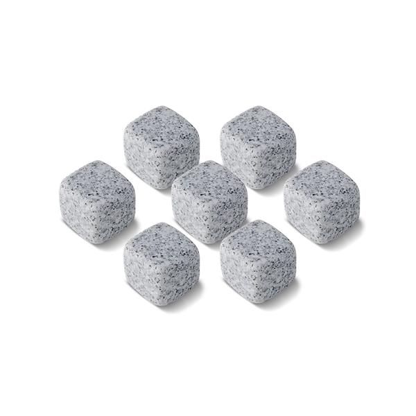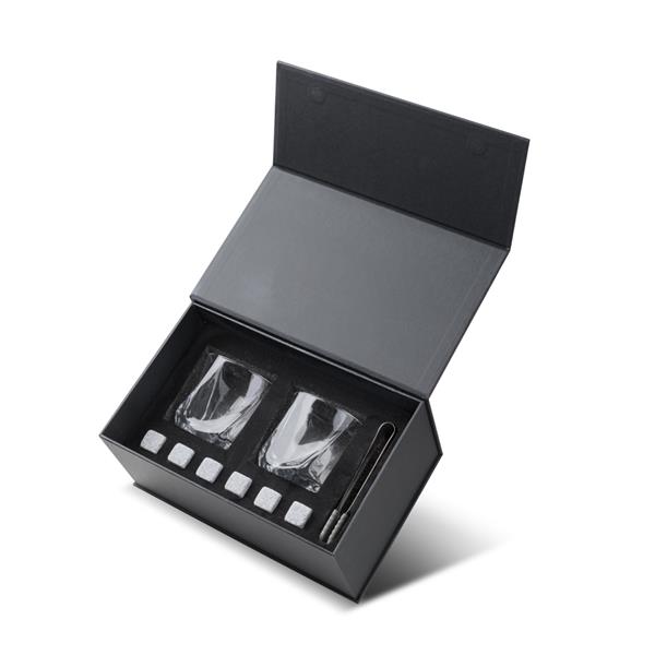 Kit drink contendo 2 copos de vidro (200ml cada), 1 pinça para gelo e 6 pedras de granito para gelo, acomodado em caixa presenteável.