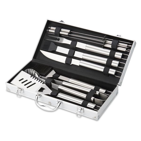 Kit churrasco 10 peças em maleta de alumínio com travas de segurança e placa central para personalização. Contém: espátula, pegador, escova para grelha, faca, pincel, garfo e quatro espetos, parte interna da maleta com revestimento em TNT e suportes de velcro para fixação das peças. Tamanho aproximado Maleta: 21,5 x 7,6 x 42,7cm