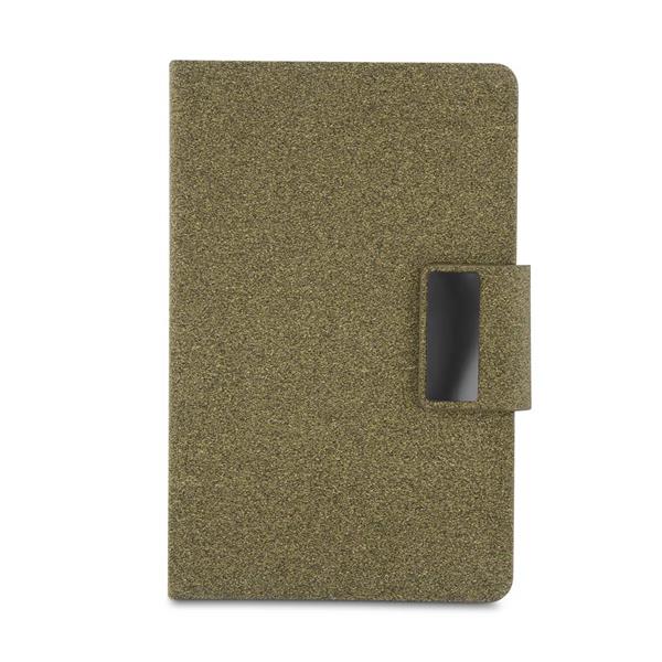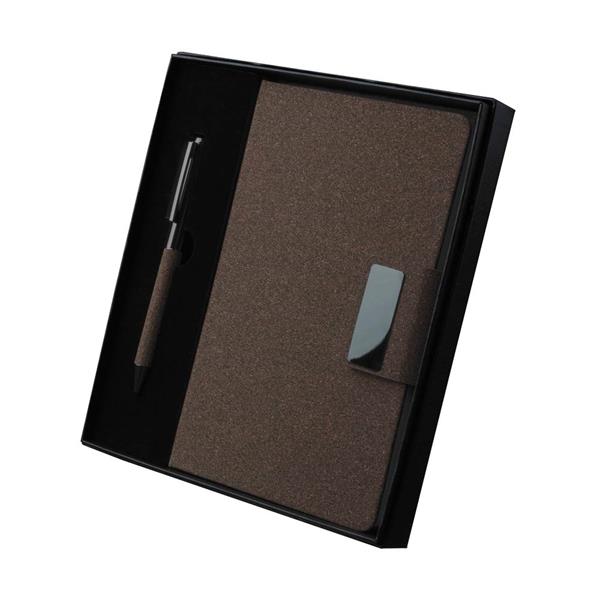 Kit de Escritório composto por caderno tamanho A5, com capa em PU e detalhe em fibra de chá ou café, contendo 80 folhas pautadas de 70g/m². Acompanha caneta metálica com acabamento no mesmo material de fibra, formando um conjunto elegante e sofisticado. O kit acompanha estojo de papelão na cor preta. Tamanho aproximado: (Caderno) 20,7x13,2cm