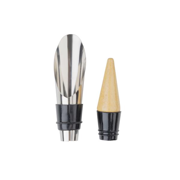 Kit vinho contendo 1 anel corta-gotas, 1 tampa de metal para garrafa, 1 bico dosador de metal e uma tampa de bambu e 1 saca-rolhas de metal e bambu com corta lacre. Acompanha caixa presenteável fabricada em papel cartonado resistente.