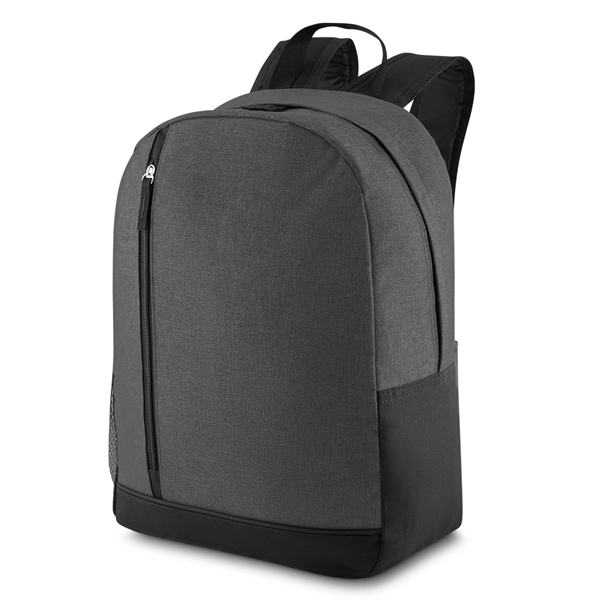 Mochila poliéster 600D e interior 210D com dois compartimentos sendo principal com abertura total, outro bolso frontal e bolso lateral, com alças de mão, parte posterior e alças almofadadas, tamanho aproximado 40 x 28 x 14 cm.