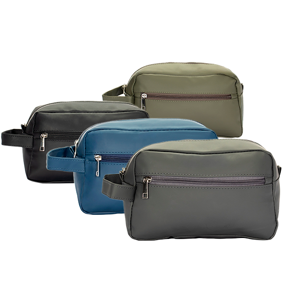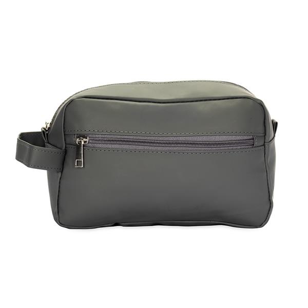 Nécessaire confeccionado em couro sintético impermeável. Possui compartimento principal com fechamento em zíper, além de um bolso frontal externo, alça de mão e duas alças menores para fixação de chaveiro ou gancho. Tamanho aproximado: 14,5 x 24 x 11cm