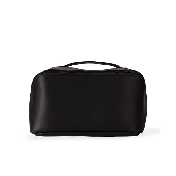 Nécessaire confeccionado em poliuretano (PU) impermeável com abertura em 180 graus que remete ao formato de uma concha. Possui amplo compartimento interno com dois bolsos laterais abertos e um central com fechamento em zíper. Contém uma alça para transporte. Tamanho aproximado: 13 x 23 x 12cm (Altura x Largura x Profundidade)