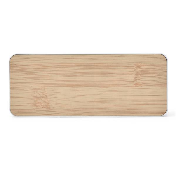 Este relógio despertador combina o design elegante de bambu e plástico com a tecnologia de um painel LED. Mais do que mostrar horas, data e temperatura, ele é um aliado para a rotina, permitindo programar alarmes com ajuste de som e dias de funcionamento. O display oferece controle sobre a luminosidade, com 3 níveis diferentes. Para maior versatilidade, o relógio pode funcionar com uma pilha AAA (não inclusa) ou via cabo USB (incluído). Tamanho aproximado: 6,5 x 15,5cm
