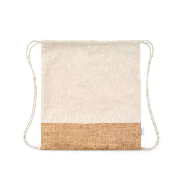 Sacola tipo mochila em 70% algodão reciclado e 30% poliéster reciclado (180 g/m²) com base em juta. Alças em algodão. Tamanho aproximado: 370 x 410 mm