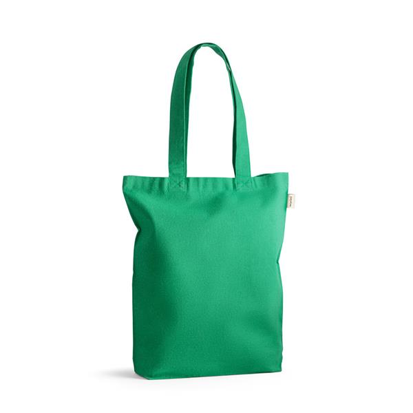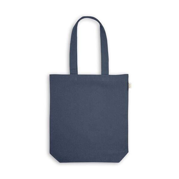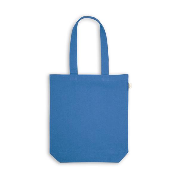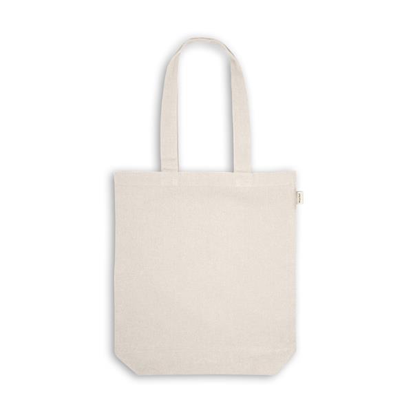 Sacola em 70% algodão reciclado e 30% poliéster reciclado (220g/m²), com alças de 65 cm. O tecido é sem tingimento, e utilizado na sua cor original, sem produtos químicos de tingimento ou branqueamento, contribuindo para um menor impacto ambiental. Tamanho aproximado: 380 x 420 x 100 mm