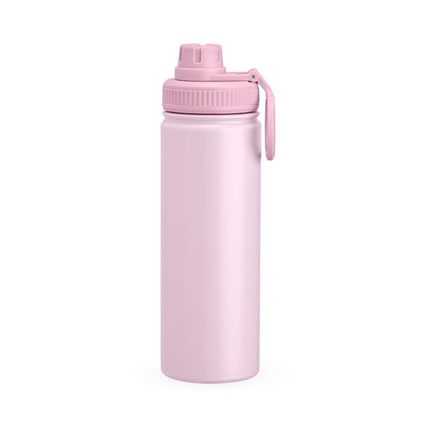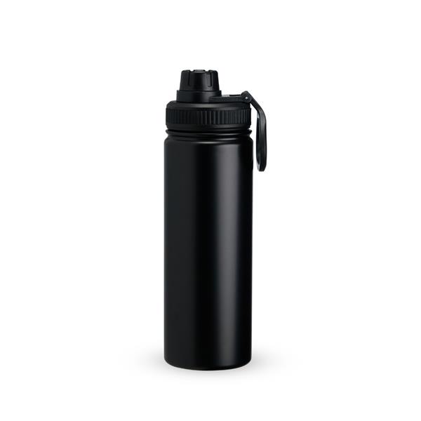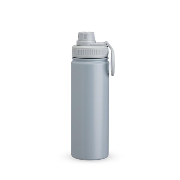 Garrafa em inox com capacidade máxima de 750ml. Conta com pintura eletrostática, que oferece uma cor duradoura e acabamento de maior qualidade e resistência. Possui tampa rosqueável em plástico com proteção para o bocal e alça para transporte.